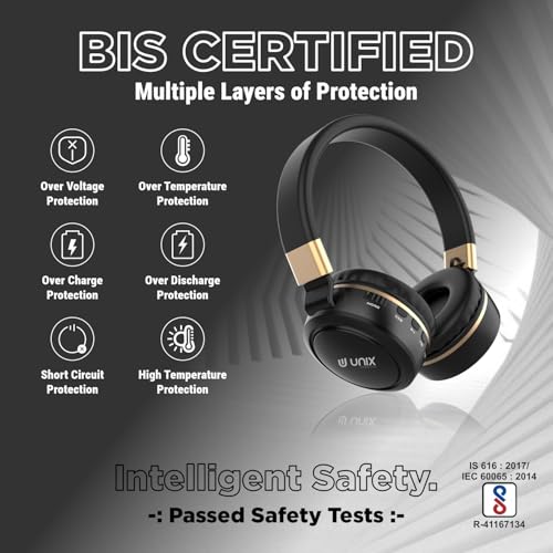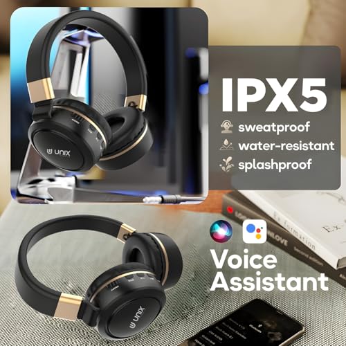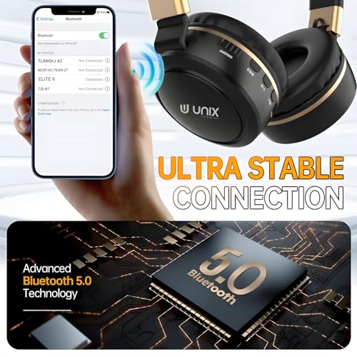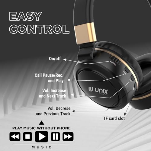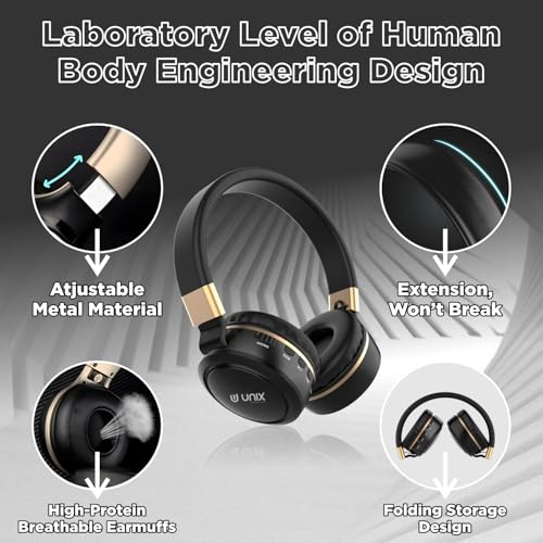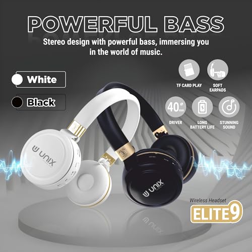 Unix Elite 9 Wireless Bluetooth Headphones with 40mm Drivers| 12-Hour Playback |Soft Earpads, TF Card Support, Foldable Design |Over-Ear Headphones for Music | Travel, Gym, Game & Calls – GoldenBlack